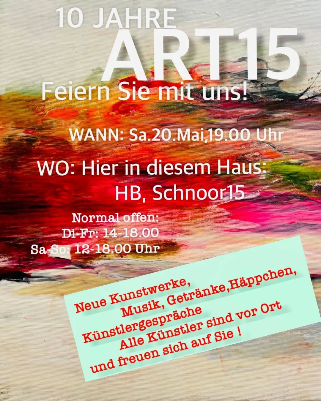 Die Künstlergemeinschaft der ART15 ist ein Zusammenschluss von mehreren, manchmal auch wechselnden KünstlerInnen, die gemeinsame Ausstellungen durchführen und den Verkauf der Kunst selbst übernehmen. Die ART15 ist im Herzen des Schnoor. Unter dem Dach des ältesten Giebelhauses von Bremen, 1402 erbaut, hat die ART15 eine ganz besondere Atmosphäre. Backstein-Architektur, alte Gewölbe, Säulen mit historischer Vergangenheit sind der Rahmen für die immer wieder wechselnden Ausstellungen. Ich bin nach telefonischer Vereinbarung gerne für Sie da,